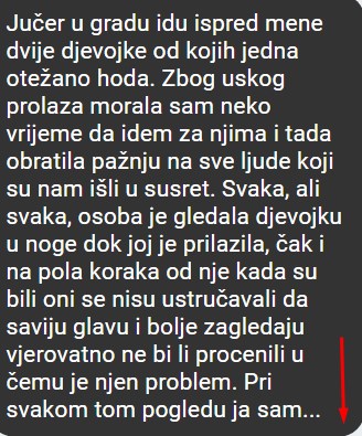Zbog uskog prolaza morala sam neko vrijeme da idem za njima i tada obratila pažnju na sve ljude koji su nam išli u susret. Svaka, ali svaka, osoba je gledala djevojku u noge dok joj je prilazila, čak i na pola koraka od nje kada su bili oni se nisu ustručavali da saviju glavu i bolje zagledaju vjerovatno ne bi li procenili u čemu je njen problem.