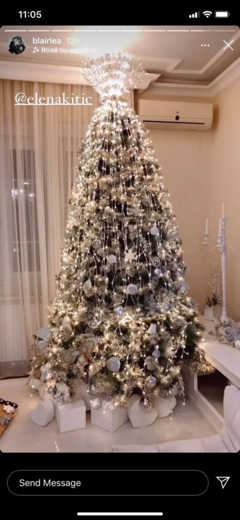 Jelka dodiruje plafon, puna je lampica, a svi ukrasi su u bijeloj boji, kao i svjećnjaci i paketići koji stoje ispod drveta. Na vrhu se nalazi poprilično neobičan ukras, napravljen od lampica, a kako sve izgleda pogledajte na slici.